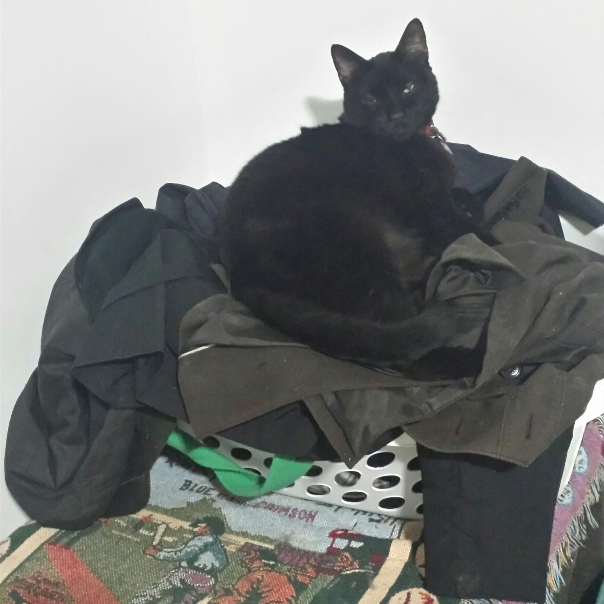 Leave a pile of dark-colored outerwear unattended long enough, awaiting its annual trip to the dry-cleaners, and eventually a dark-colored cat will claim it for his throne.