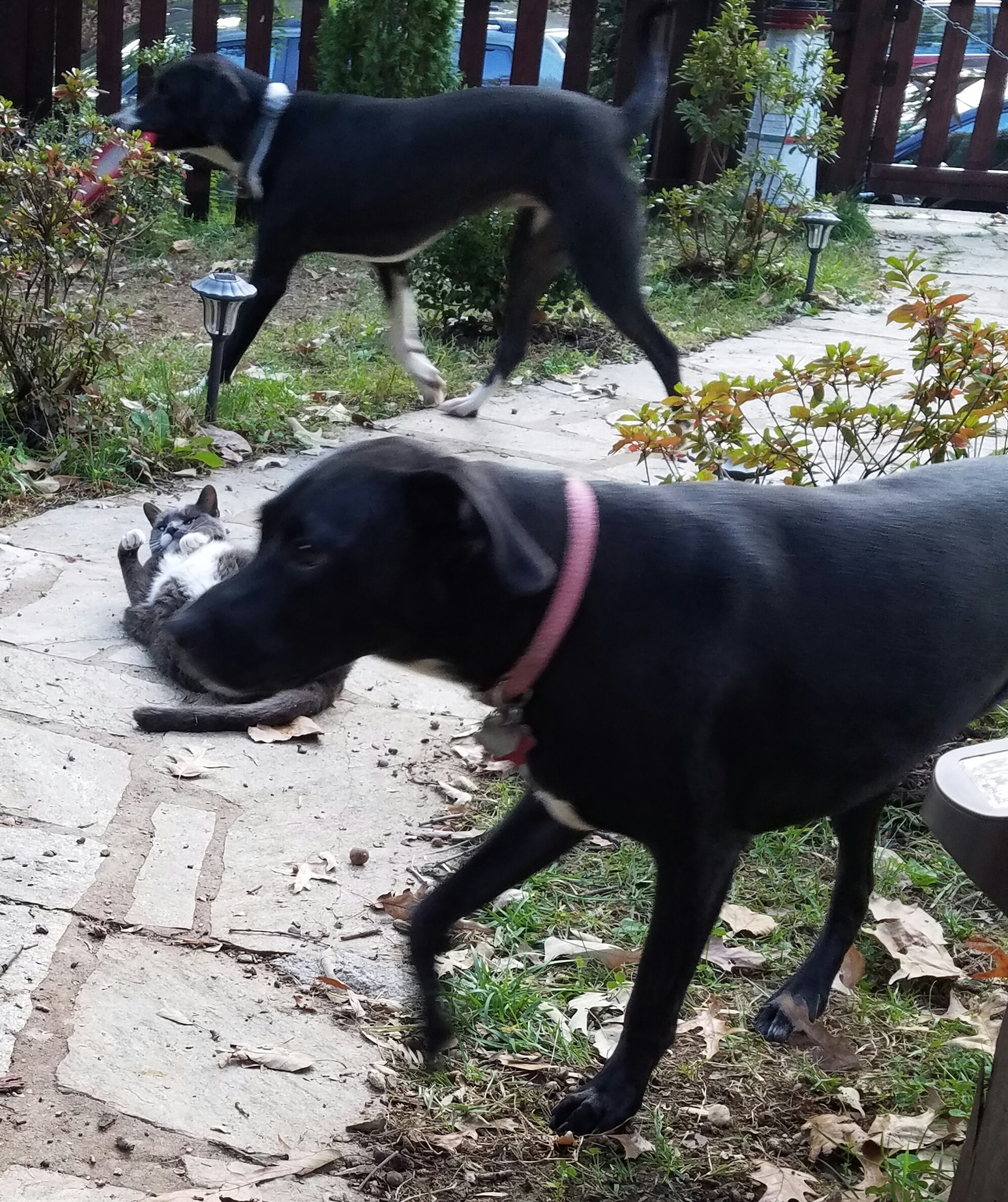 You have amazing woofies. There aren’t many that would pass up a nice soft furry cat belly. Yes, I know nail swipes.