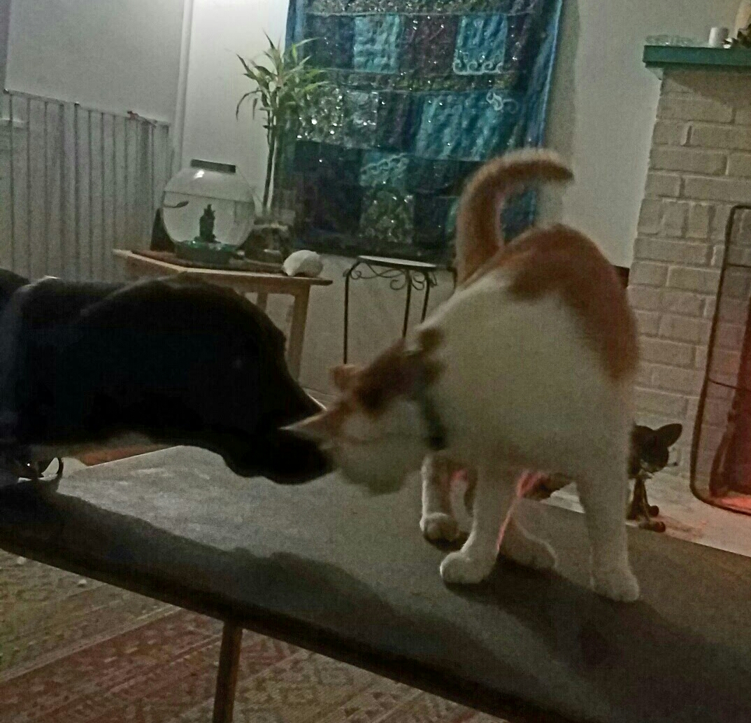 Love the cat headbutting the dog–amazing! My two goldfish Big Hoss and Little Hoss live in a 10 gallon aquarium.