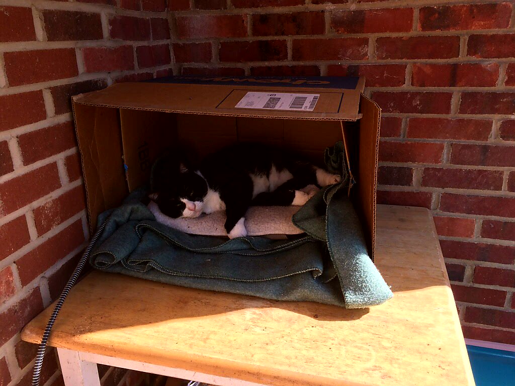 Winter Palace Posted on January 26, 2018 by sevencatsandcounting Neighbor’s Porch + Cardboard Box + Heating Pad + Towel = Winter Palace I’ll be home in the spring. –Phelps