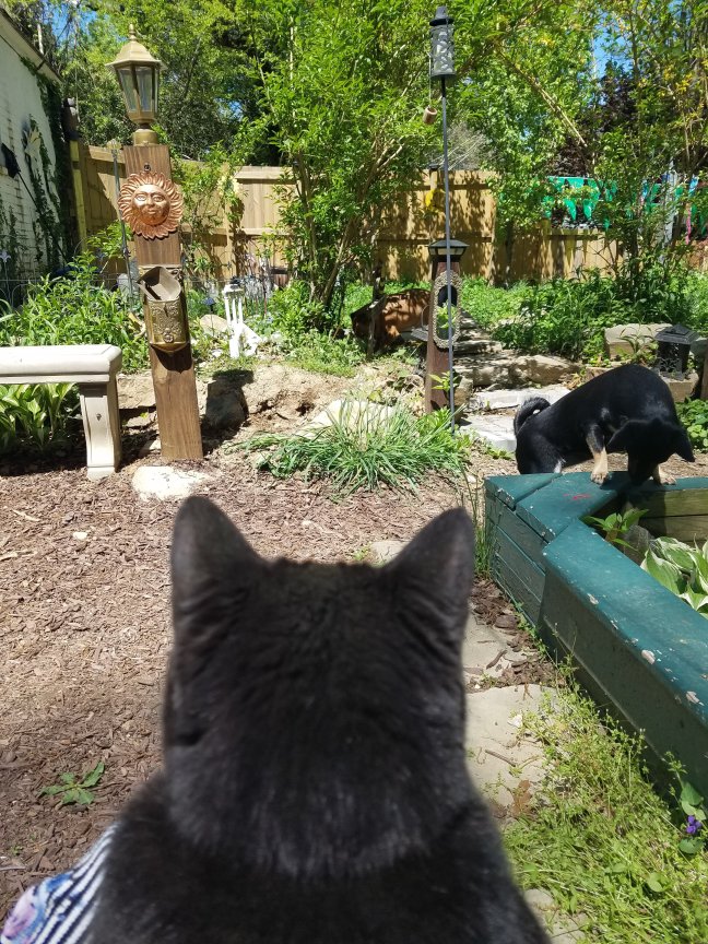 Our pond bubblers are bubbling away, we have a generous sprinkling of Fish flakes on the surface, and there’s neither a cloud nor a Meowie in sight.