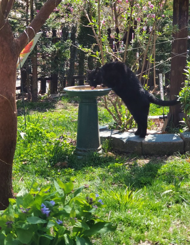 Cats and Woofies alike are drawn to the backyard oasis on an unseasonably warm, early spring day.