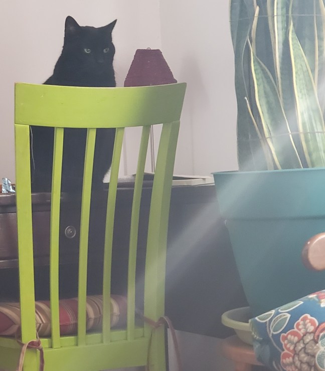 I’m a House Panther posing with a lime green chair.