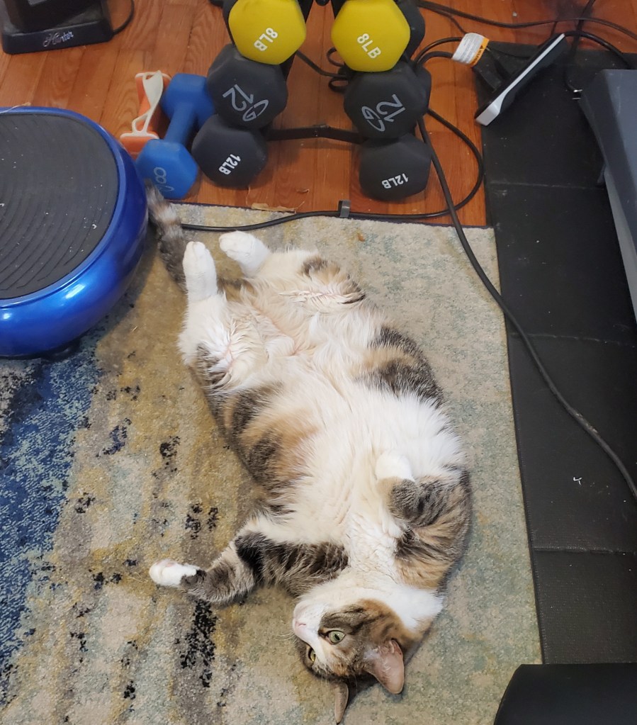 Be honest, Human Mommy, I’m not preventing you from working out by lounging luxuriously in front of your free weights.