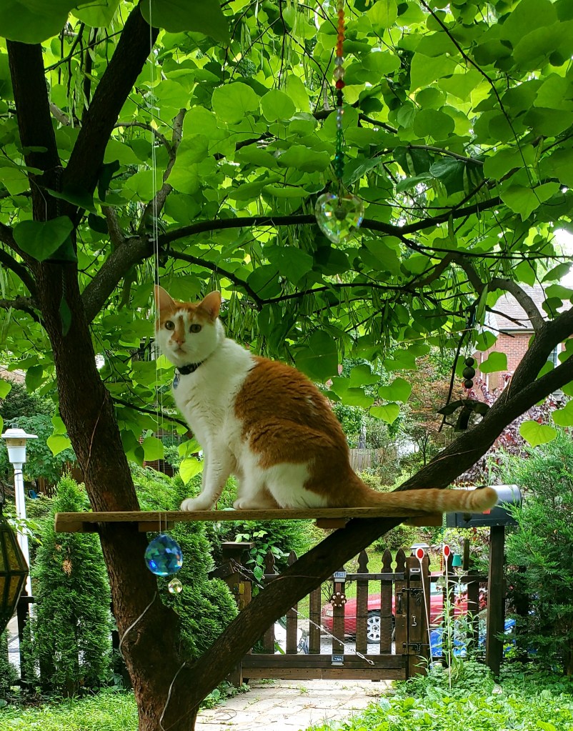 Human Daddy made us our very own cedar platform in our favorite tree.