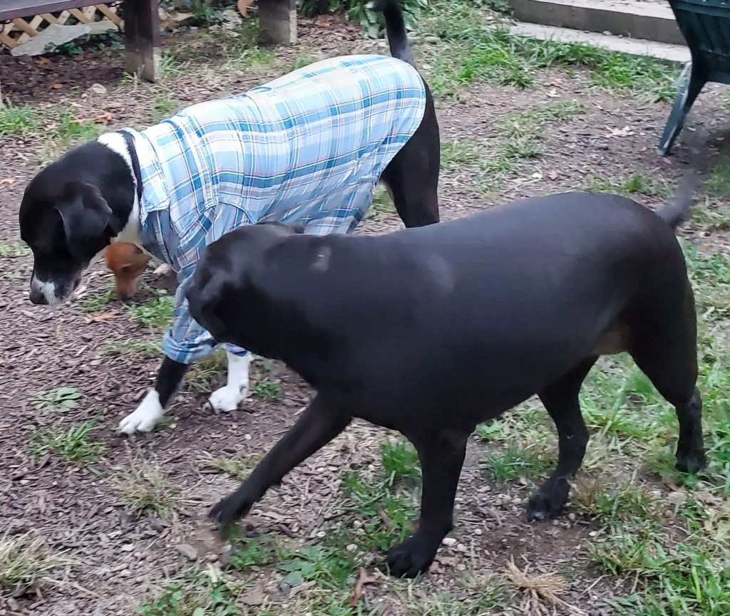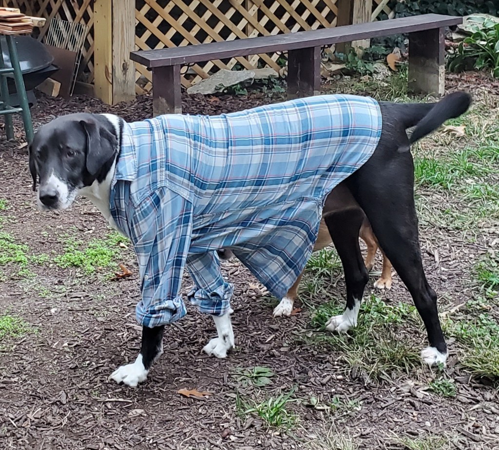 Instead, Human Daddy gave me the shirt off his back, tucked my front legs into the sleeves, and buttoned it up.