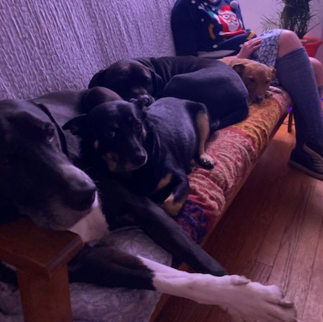 Festive Woofs and Wags, Sunny, Cosmo, Stella, and Xena