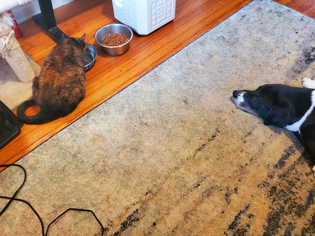 I am not staring at Amber; I am staring at the delicious smelling Meowie Kibble and thinking thoughts of dinner.