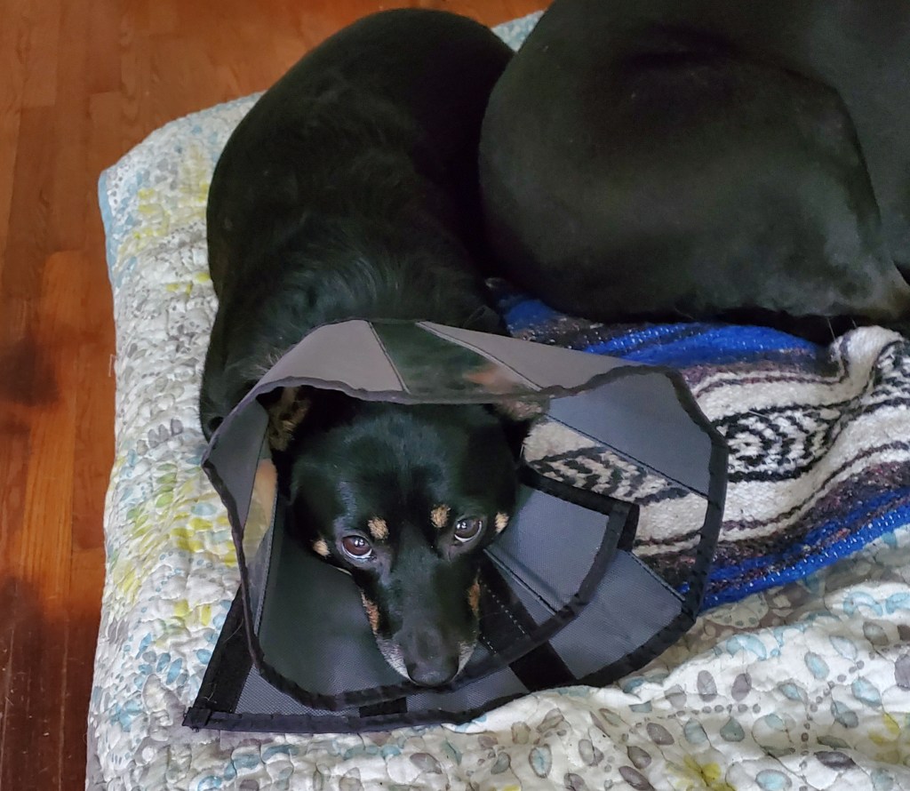 Human Daddy had to run out to the grocery store and he put me in my cone before leaving.
