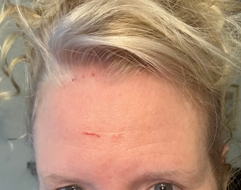 If Human Mommy hadn’t been in my way, this wouldn’t have happened. I didn’t intend to scratch her forehead—I just sort of crashed into her while I was chasing my own tail. Purrs, Apollo