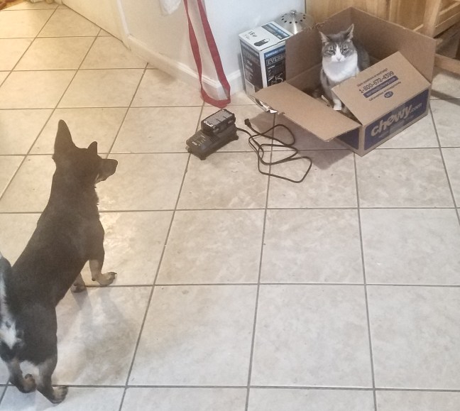 I’ll admit that chilling out in an empty carton that used to contain canned Woofie food may not be the wisest option, particularly if the Woofies have not inhaled their evening feast yet.