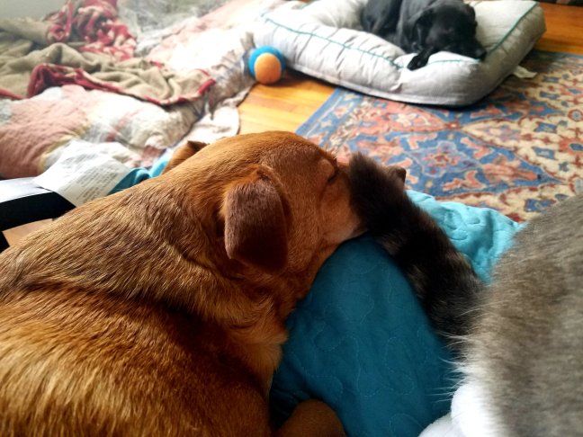 Sometimes you may find a Meowie’s tail draped over your handsome Canine muzzle.