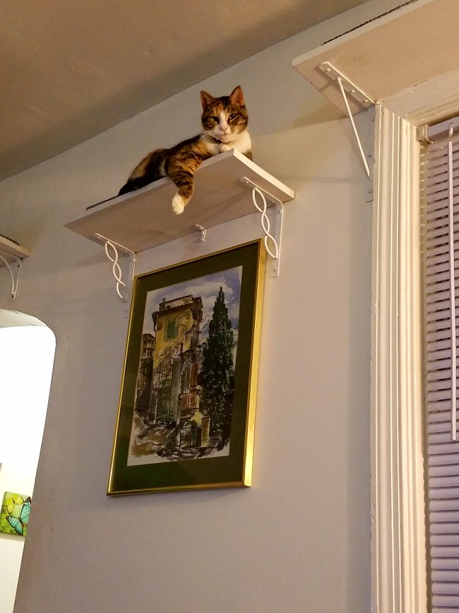 An excellent home improvement project involves installing a series of shelves up the living room wall so that we Cats can get up high, out of reach of even the tallest Woofie.