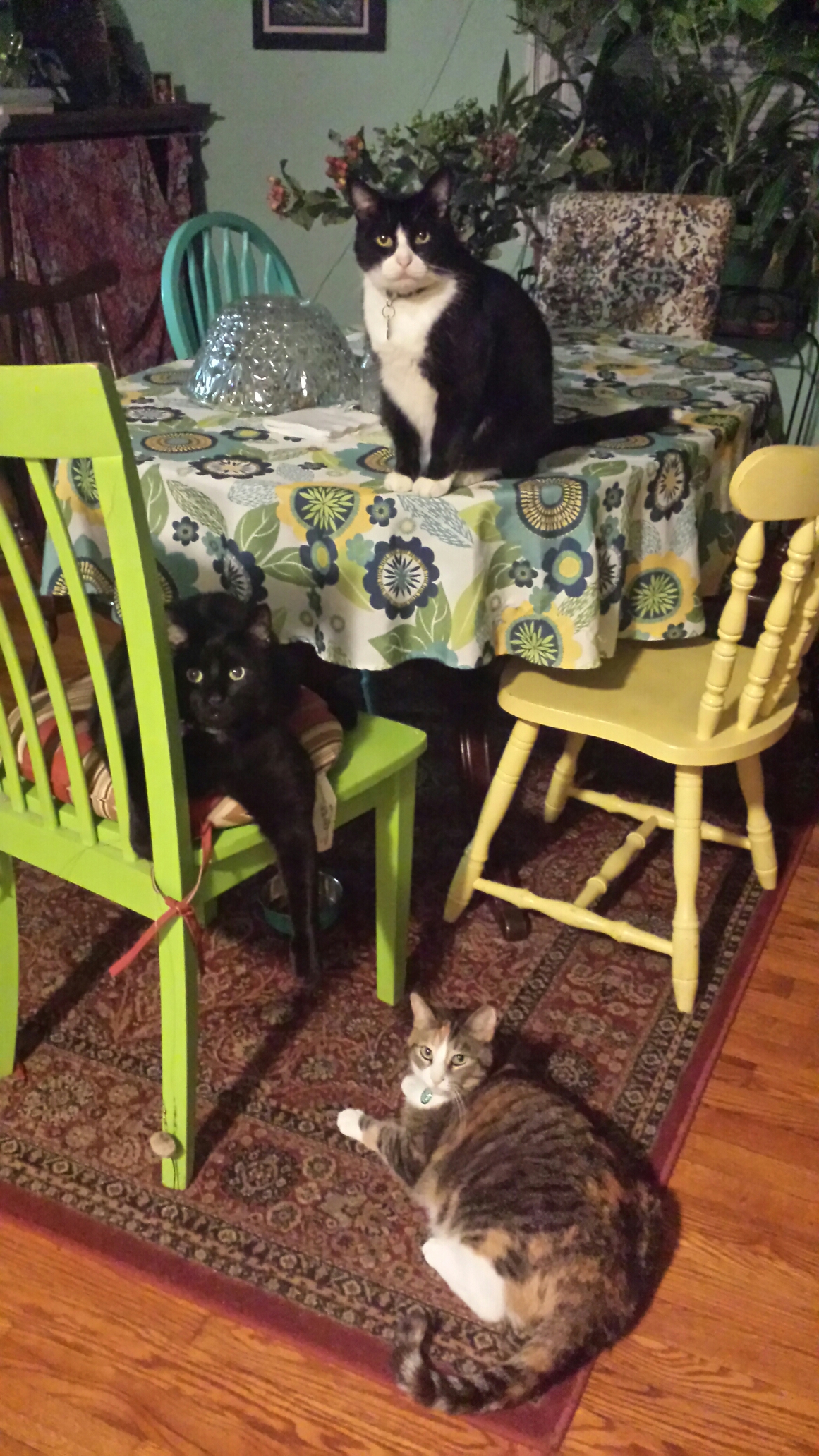 Embellishing one’s home Posted on December 15, 2015December 19, 2015 by sevencatsandcounting Nothing embellishes a room better than a trio of handsome cats. –Phelps, Darth, and Lily