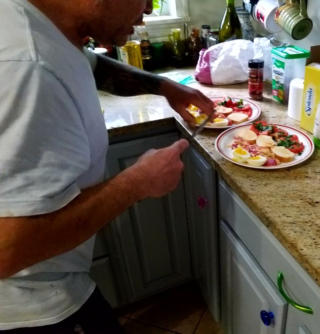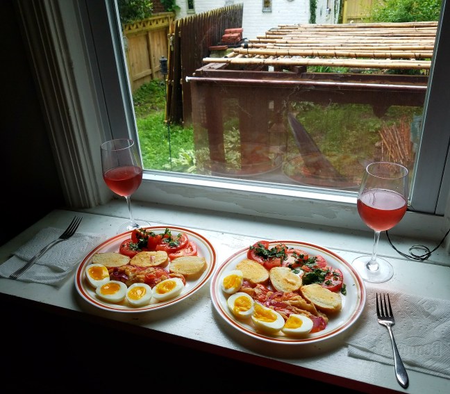 …fresh tomatoes topped with cilantro, French baguette with Himalayan salt and olive oil, sauteed cod fish with red onion and tomatoes, and soft boiled eggs.