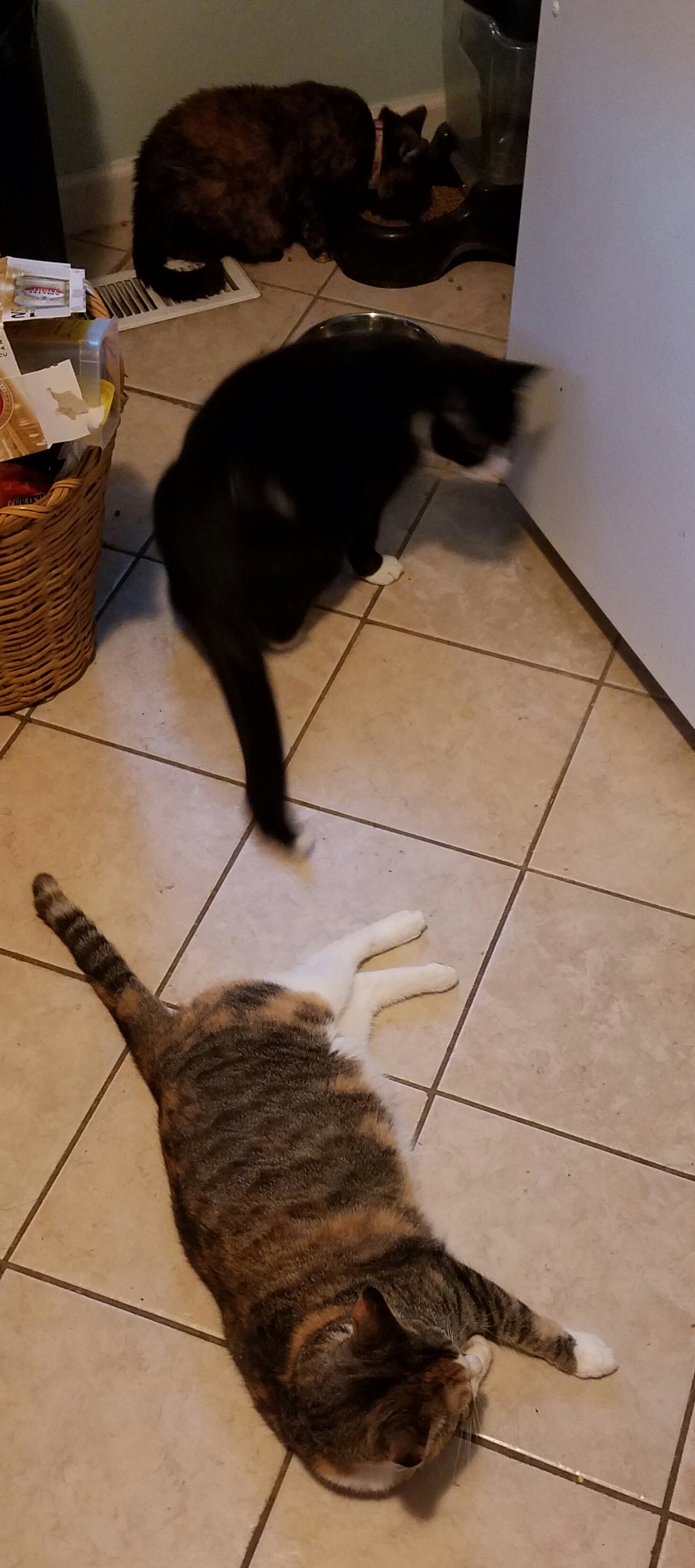 Sometimes it can be hard to tell if a Cat is in line for the kibble or not, particularly if she’s a Millennial Kitty, facing the wrong way, stretched out nonchalantly as if she’s not even hungry, caught up in texting or pokemoning or whatever else she’s doing with her snowy white paw.