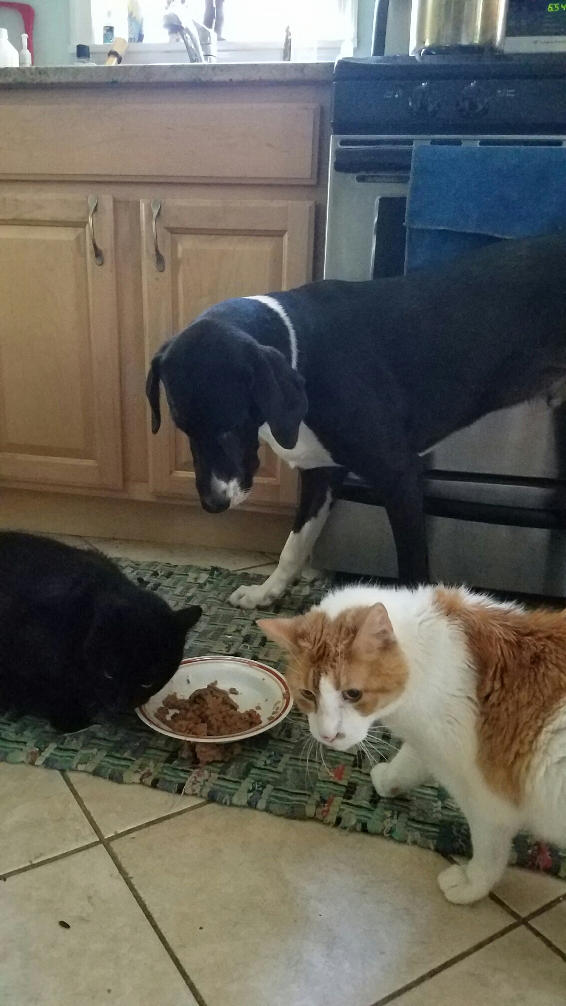 Good Company Posted on August 15, 2016August 14, 2016 by sevencatsandcounting Some of the best parties have good company but subpar Woofie food. Sniff the food politely and then find a mutually stimulating topic of conversation like squirrels. –Darth and Charlie The food smells delicious to me. Just saying… –Cosmo