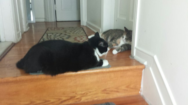 There’s no better place and time for a prolonged chat than at the top of the stairs, early in the morning, when your Human Mommy is running late for work and is wearing a new pair of platform sandals in which you’re not convinced she’s capable of balancing her clumsy self.