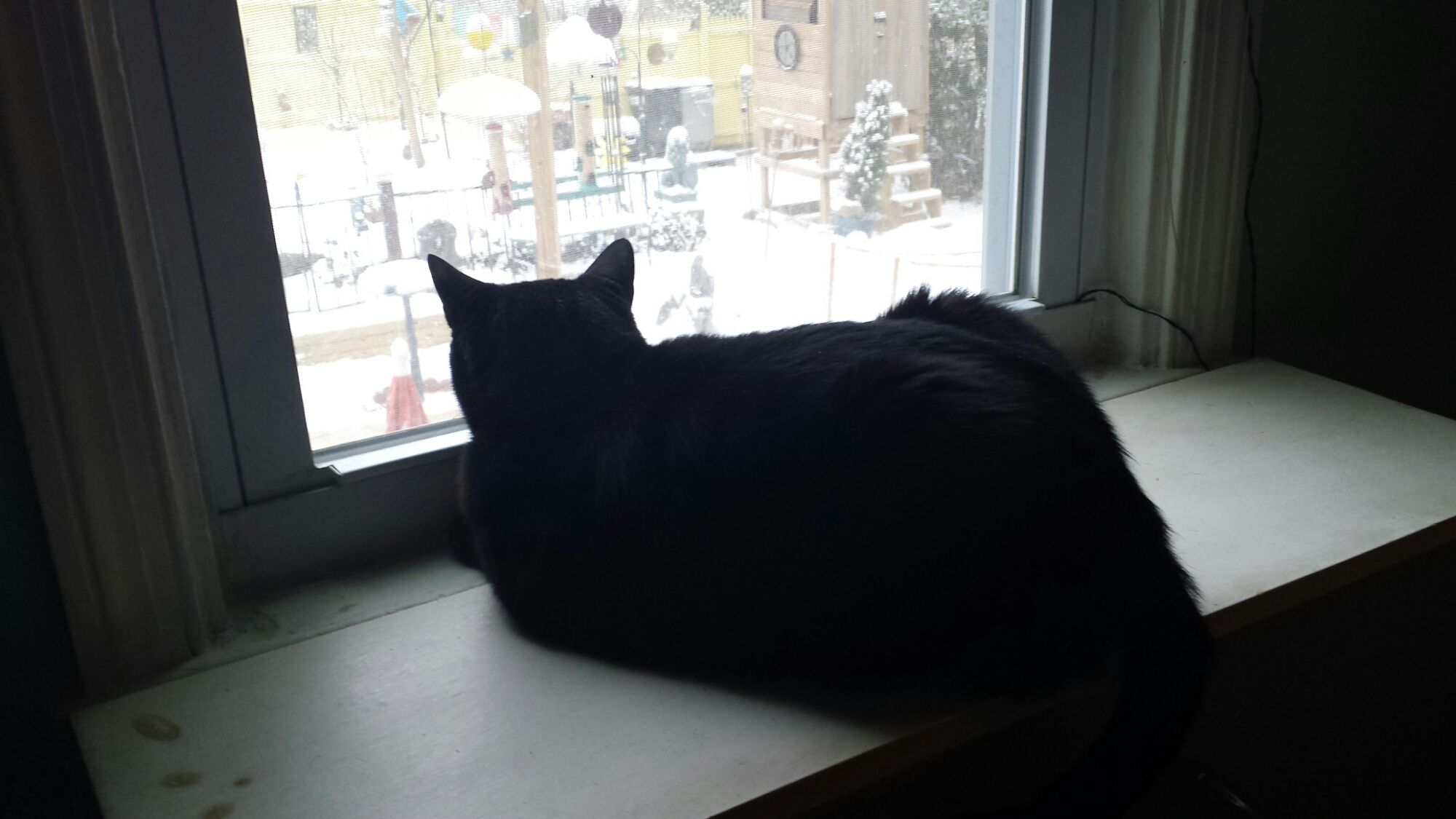 Although falling snow draws large flocks to the feeder, you recognize that your midnight fur would provide insufficient camouflage against the white backdrop. Take a moment to feel grateful that you are a house panther who can watch birds for entertainment and whose food bowl is filled by the servants… er… humans.